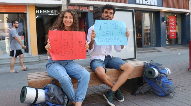 Malatya'da üniversite okuyan 2 genç, ziyaret ettikleri şehirlerde yemek giderlerini sağlamak için 1 liraya dert dinliyor. Otostop çekerek yolculuk yapan gençler, dertlerini anlatanları sabırla dinlediklerini söyledi.