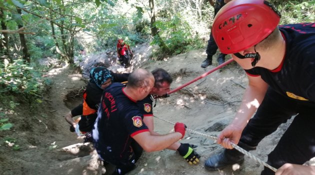 Kocaeli’nin Derince ilçesinde bulunan mesire alanının yürüyüş parkuru kısmında şelalenin aktığı dere yatağına inmek isterken, yaklaşık 10 metre yükseklikten aşağı düşüp yaralanan kadını, itfaiye eri sırtına alarak kurtardı.