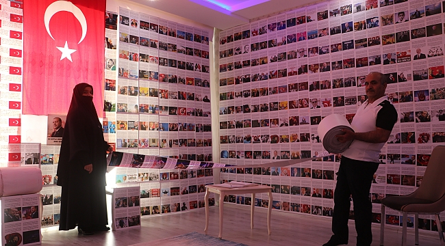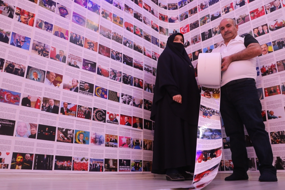 Şair Nusret Başyiğit, evinin salonunda sergilediği şiirlerini gören vatandaşların fotoğraf çekinmek istediğini belirterek “Malatyalıyım, şiir yazmaya çalışıyorum. Şairim demeyelim, üstatlarımız bize kızar. 2 bin 23 hedefimize yazdığımız 2 bin 23 şiirimize yaklaşık 8 buçuk yıl önce başladım. İlk önce 6 bin mısralık 200 metre uzunluğunda rulo halinde, el yazması ‘candır, cenettir benim ülkem’ isimli bir şiir yazdım. Onu bitirdikten sonra sayın Cumhurbaşkanımızın ve bu kutlu davaya gönül vermiş bütün insanları bir fotoğrafla, şiirle bütünleştirerek 2 bin 23 hedefimize 2 bin 23 şiir yazdım. Bu şiirlerimizi hem 520 metre uzunluğunda rulo halinde yaptık hem de evimizin salonunda sergiledik. Değerli dostlarımız gelip, bakıp okuyorlar. Beğenmeyende oluyor. Ben işin en rahat kısmını burada seçtim, 8 buçuk yılda yazdığım şiirleri yazmak çok zordu. En rahat kısmı bu oldu çünkü ruloları indirip, kaldırması zor oluyor. Yer bulmak zor oluyor, eşime nazım geçtiği için evi kiraladık sayılır. Evimizin salonunu boşalttık, bu şekilde şiirlerimizi sergiliyoruz. Şimdiye kadar gören hiç kimseden olumsuz bir tepki almadık, zaten hedefimiz belli. Kutlu davamıza 2 bin 23 şiir yazdık. Şiirlerimiz toplam 22 bin 184 mısra oldu. Özellikle fotoğraf çekmek için gelen çok oluyor. Onlara da kapımız açık isteyen gelip fotoğraf çekebilir” dedi.