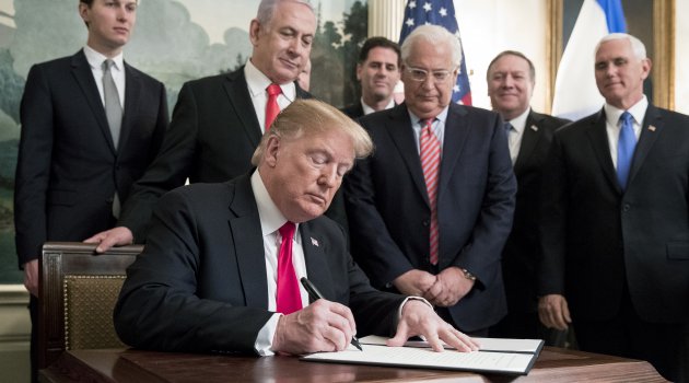 ABD Başkanı Trump, İsrail Başbakanı Binyamin Netanyahu ile düzenlediği basın toplantısında Golan Tepeleri’ni İsrail’in toprağı kabul eden kararnameyi imzaladı. Trump, “İsrail yakın dostumuz ve önemli bir müttefikimizdir. ABD her zaman İsrail’in yanında olmaya devam edecektir.” dedi.