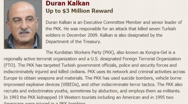 ABD Dışişleri Bakanlığının “Rewards for Justice (Adalet için Ödül)” programı kapsamında 3 PKK’lı terörist başının kimlik ya da yer tespitini mümkün kılacak bilgiler karşılığında para ödülü vereceğini açıkladı. Bakanlık, Murat Karayılan için 5 milyon dolar, Cemil Bayık için 4 milyon dolar ve Duran Kalkan için 3 milyon dolar ödül koydu. Adalet için Ödül programının resmi sayfasında teröristlerin fotoğrafları ve kişisel bilgileri ayrıntılı olarak paylaşıldı.