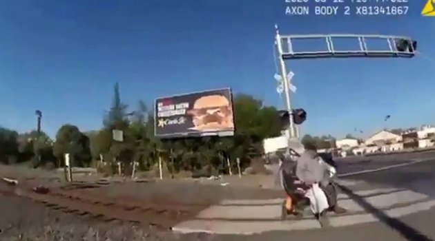 ABD'nin Lodi kentinde bir polis, tekerlekli sandalyesi tren raylarına sıkışan yaşlı adamı son anda çekerek kurtardı.