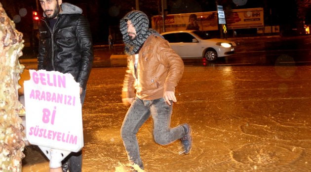 Cadde ve sokakların sel suları nedeniyle göle döndüğü Adıyaman’da hem sürücüler hem de yayalar zor anlar yaşadı. Sürücülerden bazılarının araçları göle dönen caddede ilerleyemezken, vatandaşlarda ilerlemekte güçlük çekti.