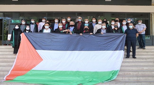 Malatya’da hukukçular, Filistin bayrağı açarak İsrail zulmünü kınadılar.