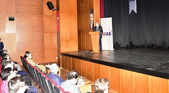 İl Afet ve Acil Durum Müdürlü Mustafa Türker yaptığı konuşmada, “Toplumda afet farkındalığının gelişmesi ve afet kültürünün yerleşmesi, yaşadığımız afet deneyimlerinden ders çıkararak bilgilerin kalıcılığının sağlanması, toplumda risk azaltma ve önlem alma konusunda davranış değişikliğinin oluşturulması ve bu şekilde afete hazır bir toplum oluşturulması hedefini gerçekleştirmek üzere İçişleri Bakanlığımızca Bakanımız Süleyman Soylu'nun talimatları ve öncülüğünde 2001 yılı “Afet Farkındalığı Eğitim Yılı” olarak ilan edilmiştir” dedi ve farkındalığın oluşmasına yönelik İçişleri Bakanlığı tarafından hazırlanan sunumu yaptı.
