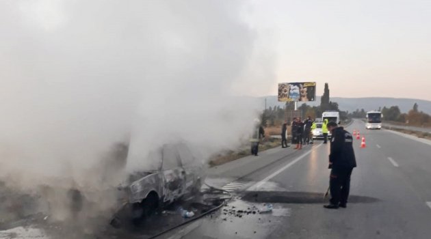 Çorum’da hareket halinde alev alan otomobil kül oldu.