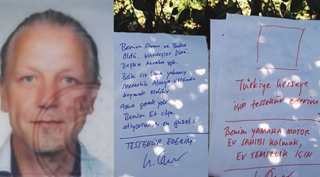 Antalya'nın Alanya ilçesinde yerleşik yaşayan 57 yaşındaki Alman uyruklu erkek turist yalnız kaldığı evinde ölü bulundu. İntihar ettiği şüphesi üzerinde durulan Alman'ın evinde “Benim anne, baba ve kardeşler öldü. Benim et çöpe atıyorsunuz en güzel” ve “Türkiye her şey için teşekkür ederim” yazılı not bulundu.