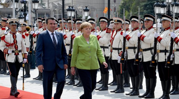 Almanya Başbakanı Angela Merkel, Makedonya'ya gerçekleştirdiği resmi ziyarette Başbakan Zoran Zaev tarafından Makedonya Başbakanlığında törenle karşılandı.