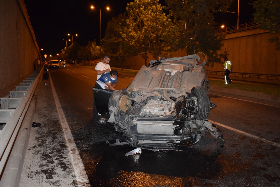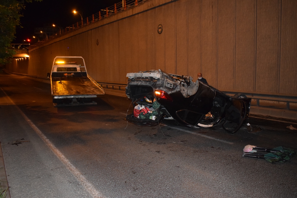 Çarpmanın etkisiyle takla atarak savrulan otomobil yol üzerinde ters dönerek durdu. Feci kazada araçtan fırlayan S.D. ile sürücü F.K. ağır şekilde yaralandı.