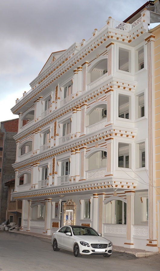 Yapıyla ilgili açıklamalarda bulunan şirket sorumlusu Özgür Şahin, mimaride kullanılan malzemenin çok hassas olduğunu belirterek, malzemelerin yurt dışından getirildiğini söyledi. Şahin, “Dış cephe tamamen bir saray edasında. Tavan ve duvar işlemleri altın yaldızlıdır. Mimaride kapı kolları ve musluklarda 24 ayar altın kaplama kullanılmış olup, mobilyalar altın yaprak ile işlenmiştir. Süslemelerde ise altın yaldız ve kristaller kullanılmıştır. Çelik kapılar özel güvenlikle tasarlanmıştır. Kapılarda parmak okuma sistemi mevcuttur. Özel bir güvenlik sistemi ile korunmaktadır” diye konuştu.