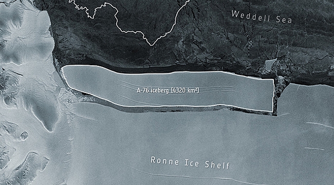 Avrupa Uzay Ajansı (ESA), Antarktika'nın kuzeybatısında yer alan Ronne Buz Sahanlığı'ndan 4 bin 320 kilometrekarelik bir buz kütlesinin koptuğunu bildirdi. ESA tarafından yapılan açıklamada, 175 kilometre uzunluğa ve 25 kilometre genişliğe sahip buz kütlesinin ABD'nin New York kentinin 4 katı büyüklüğünde olduğu ve Weddell Denizi'ne doğru sürüklendiği kaydedilerek, devasa buz parçasının, kopmasının ardından dünyanın en büyük buzdağı olarak kayıtlara geçtiği belirtildi. ESA'ya ait Sentinel-1 uydusuyla görüntülenen devasa buz kütlesinin fotoğrafları ESA tarafından internette yayınlandı.