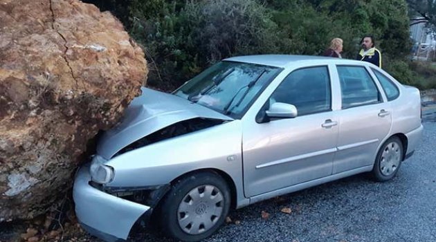 Milas’ın Bozalan Mahallesi’nde, yolda seyir halinde olan aracın üzerine aşırı yağışlardan kaynaklı kopan dev kaya parçası düştü. Şans eseri, olayda yaralanan olmadı.