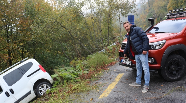 Kocaeli’nin kayak merkezi Kartepe yolunda kontrolden çıkan hafif ticari araç, bariyerleri parçalayarak şarampole devrildi. 1 kişinin yaralandığı kazada yoldan geçen bir sürücü, kaza yapan aracı uçuruma yuvarlanmaması için arazi aracının vincine bağladı.