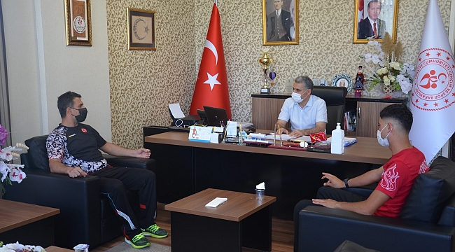 Avrupa üçüncüsü olan sporcu Serhat Güngör'ü kabul eden Malatya Gençlik ve Spor İl Müdürü Ebu Bekir Kayhan, Serhat Güngör’ü tebrik ederek hediye verdi.