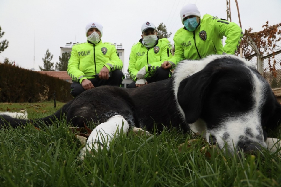 Malatya'da il Emniyet Müdürlüğü'ne bağlı Bölge trafik Denetleme Şube Müdürlüğü bahçesine sığınan ayağı kırık yaralı köpeğe polisler sahip çıktı.