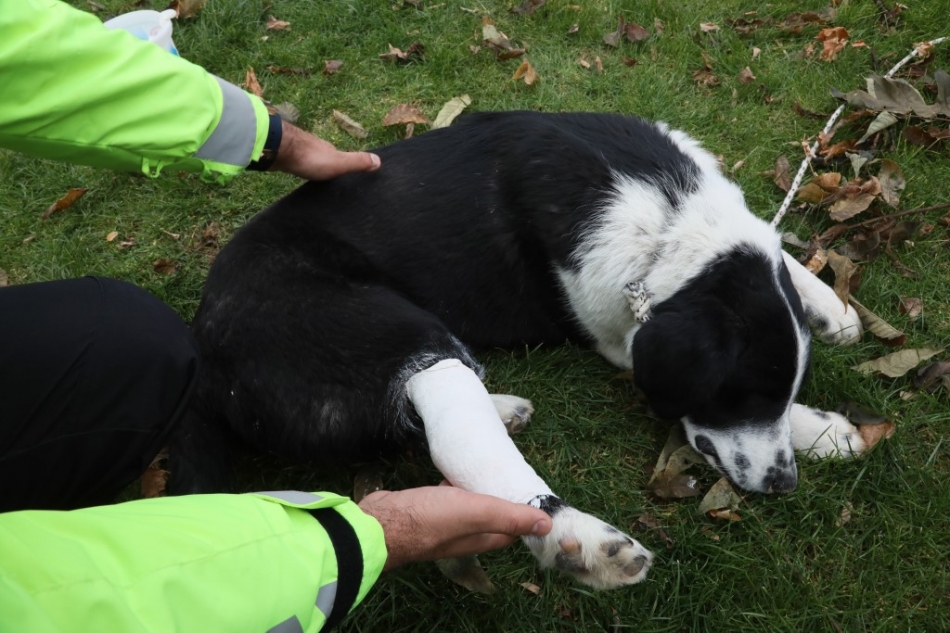 Ayağı kırılan köpeğe polis sahip çıktı