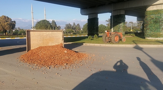 Antalya'nın Manavgat ilçesinde seyir halindeki traktörün bağlantı demiri kopan römorku devrildi. Kazada kimsenin burnu bile kanamazken, devrilen römorkun üzerinde bulunan toprak yola döküldü.