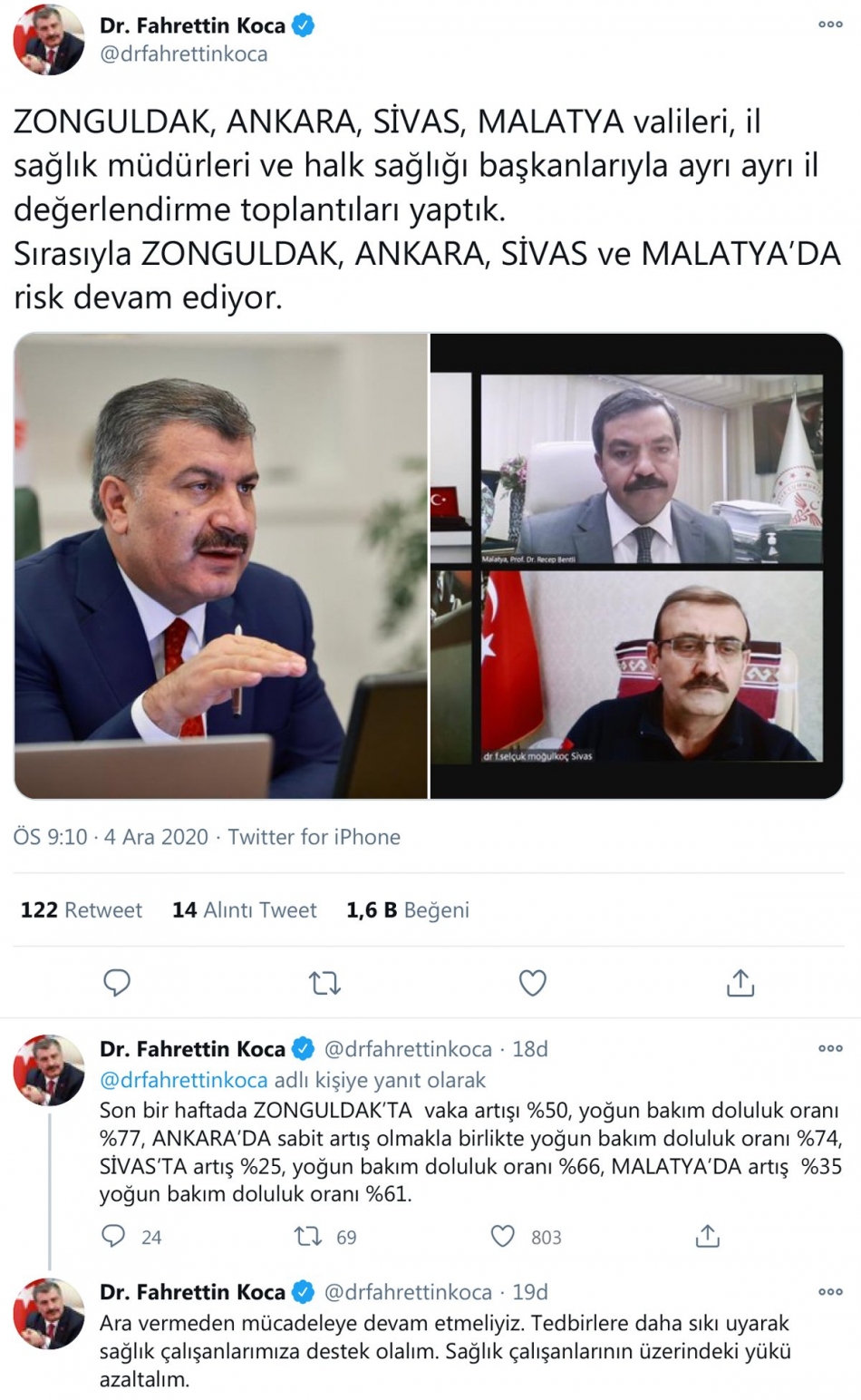 Sağlık Bakanı Fahrettin Koca; Zonguldak, Ankara, Sivas, Malatya valileri, il sağlık müdürleri ve halk sağlığı başkanlarıyla ayrı ayrı toplantı yaptığını duyurarak 4 ilin vaka artış ve yoğun bakım doluluk oranlarını açıkladı.
