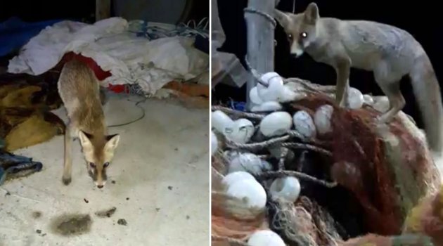 Turan Mahallesi'nde gece yarısı denizden dönen ve teknede bulunan palamut ağlarını kıyıda temizleyen balıkçıların yanlarına tilki misafir oldu.