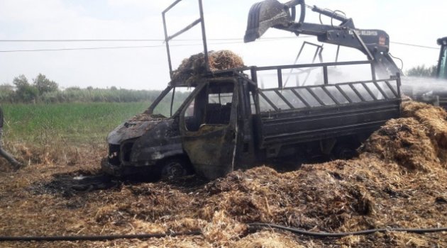 Osmaniye’nin Sumbas ilçesine bağlı Alibeyli köyünde saman balyası yüklü kamyonette çıkan yangın sonrası araç küle döndü.