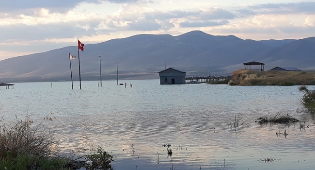 Türk Bayrağı ve Kale Belediyesinin bayrağı göl alanında dalgalanıyor.