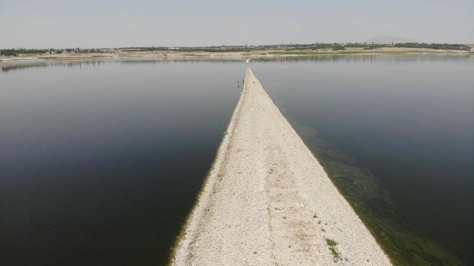 Malatya’da Karakaya Baraj Gölü’nde suların çekilmesiyle ortaya çıkan demir yolu köprüsü, barajı adeta ikiye ayırdı.