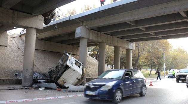 Bariyerlere çarpan tırın kupası köprüden aşağıya düştü
