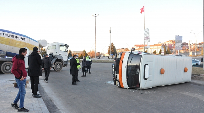 Karaman’da beton mikseri ile çarpışan minibüs kavşakta devrildi.