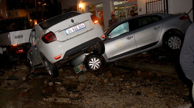 Muğla’nın Bodrum ilçesinde öğle saatlerinde önce hortum oluştu, ardından dolu ve son olarak şiddetli yağış sonrası kent merkezi ile Bitez, Gümbet, Konacık ve Ortakent mahallelerinde sel ularına kapılan araçlar yollarda sürüklendi, ev ve işyerleri büyük hasar gördü.