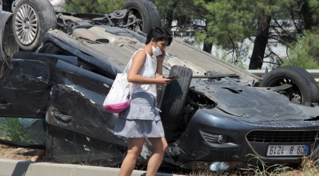 Muğla’da önündeki araca çarparak takla atan araç sürücüsü kadın ve yanındaki yolcu kazadan burnu bile kanamadan kurtuldu.