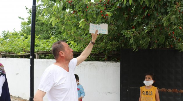 Bahçeden sarkan kiraz dallarındaki yazıyı okuyan vatandaşlar ise kirazların tadına bakıyor.