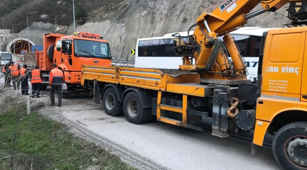 Bursa Ankara yolu mezitler bölgesinde karayollarına ait kamyon ile otomobil çarpıştı. Kontrolden çıkan kamyon yol kenarındaki bariyerlere çarparak yan yattı. Kazada 3 işçi hafif şekilde yaralandı.