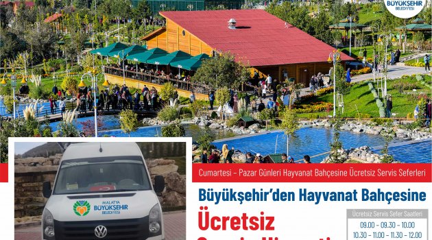 Malatya Büyükşehir Belediyesi Basın Yayın ve Halkla İlişkiler Daire Başkanlığı tarafından yapılan açıklamada, Hafta sonu Cumartesi - Pazar günleri vatandaşların Hayvanat Bahçesini daha rahat ulaşım sağlamaları için 16 Mart 2019 Cumartesi gününden itibaren ücretsiz ring hizmeti başlatıyor. Ücretsiz ring ulaşım hizmeti, Mişmiş Park Tarım Fuarı çevre yolu kavşağından Hayvanat Bahçesine giriş yapılan yol kenarında her yarım saatte bir ring hizmeti verilecektir.