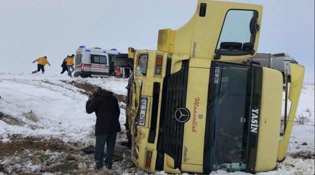 Buzlu yolda yoldan çıkan tır devrildi: 1 yaralı