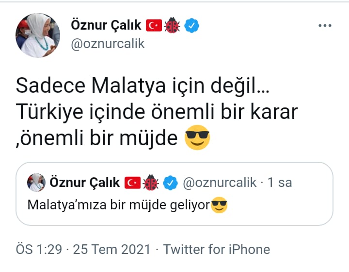 AK Parti Merkez Karar Yönetim Kurulu Üyesi ve Malatya Milletvekili Öznur Çalık'ın sosyal medya hesabında yaptığı 'Malatya'mıza bir müjde geliyor' açıklaması heyecan yaratırken, ikinci bir açıklama yapan Çalık, " Sadece Malatya için değil… Türkiye içinde önemli bir karar ,önemli bir müjde " açıklamasında bulundu