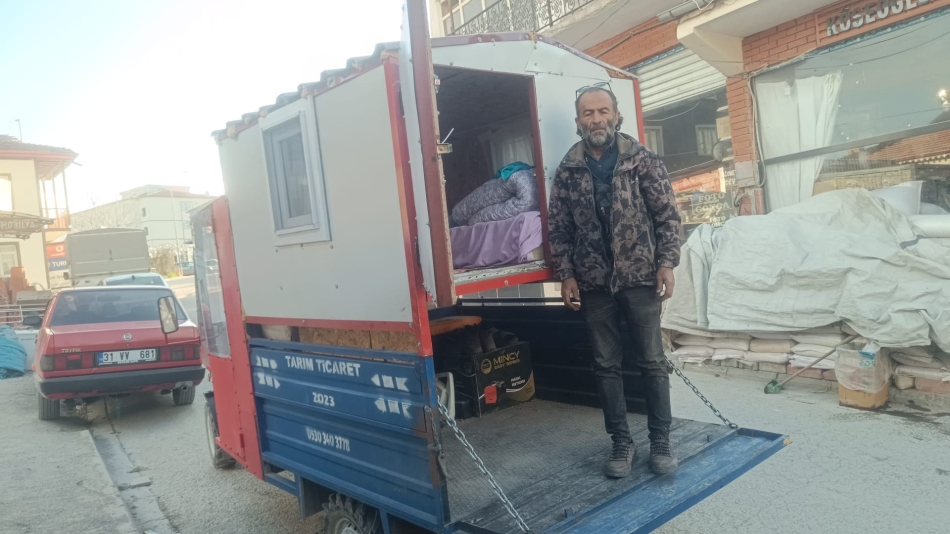 Gündüzleri aracıyla yük taşıyarak ekmek parasını kazanan Yıldız, akşamları ise kendi imkânlarıyla karavana dönüştürdüğü aracında konaklıyor.