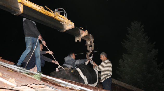 Bolu’da bir evin çatısında mahsur kalan manda vinç yardımıyla kurtarıldı.
