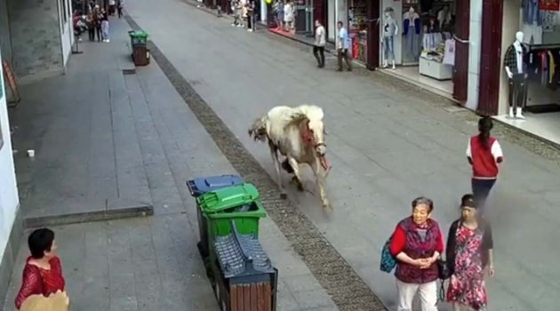 Çin'in Anhui eyaleti Huangshan şehrinde başı boş bir at alışveriş caddesine daldı. Hızla koşan at, caddede yürüyen yayaları ezdi. Bir işletmenin güvenlik kamerasına kaydedilen görüntülerde, koşarak gelen atın yaşlı bir kadını ezdiği görülüyor. Ağır yaralanan yaşlı kadının olay yerine gelen sağlık ekipleri tarafından hastaneye kaldırıldığı belirtildi. Atın daha sonra ise farklı bir noktada 2 yayaya daha çarptığı öğrenildi.