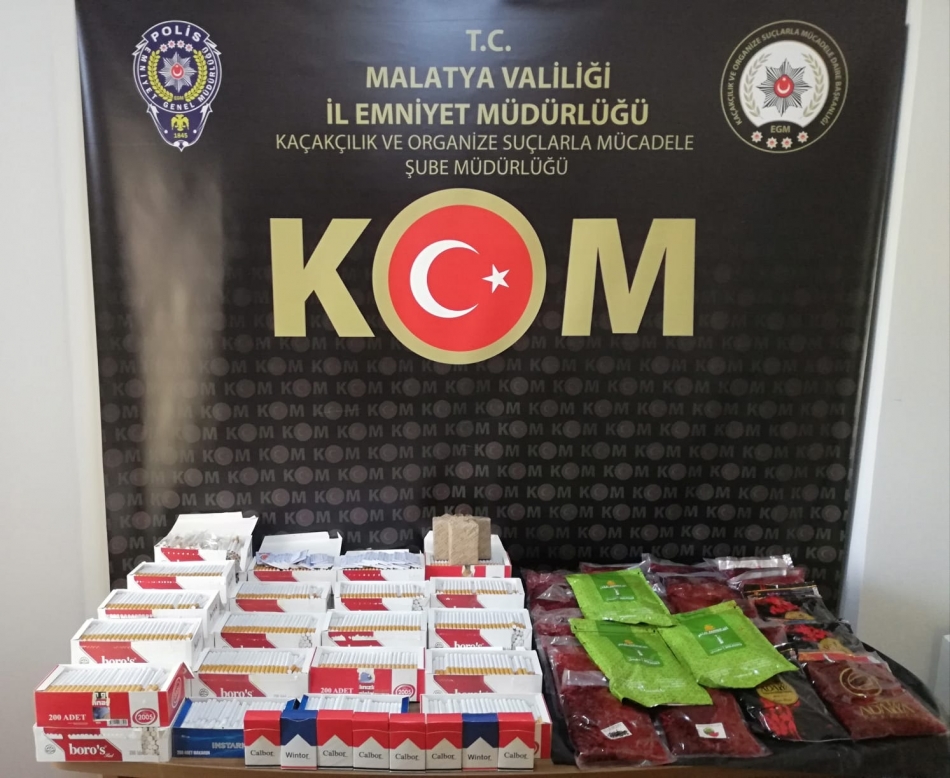Edinilen bilgiye göre, Malatya Emniyet Müdürlüğü Kaçakçılık ve Organize Suçlarla Mücadele Şube Müdürlüğü (KOM) ekiplerince kent merkezinde gerçekleştirlen 3 ayrı çalışmada bin 75 adet cinsel içerikli ürünler ile 5 bin 160 adet içi dolu makaron, 175 adet gümrük kaçağı sigara sarma kağıdı, 23 kilogram nargile tütünü ele geçirildi.