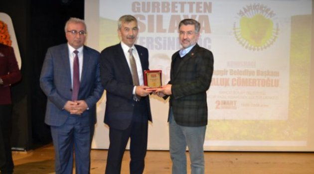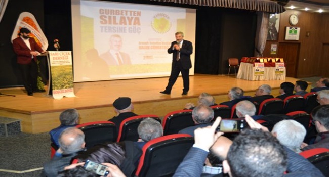 Konuşmaların ardından konferans için sahneye çıkan Arapgir Belediye Başkanı Haluk Cömertoğlu; “İnsan hayatı mevsimler gibidir, İlkbahar mevsimini yaşayanlar şu an okullarında, yaz aylarını yaşayanlar ise çalışıyor. Ben ise güz denilen mevsimdeyim. Yaşım 50’nin küsuratlarında. Sarıçiçek Derneğinin düzenlediği ‘Gurbetten Sılaya Tersine Göç’ konusunu kendi dilimin döndüğünce sizlere anlatmak için burada bulunuyorum. Her insanın Sıla’sı kendi geninde yaratılış kodunda saklıdır. Baba yurduna gelecek olursak orası bir gün muhakkak gideceğimiz yerdir. Aman kardeşlerim siz vaktinde gelin. Sıla-i Rahim dediğimiz, kelime anlamında bile Alah’ın isminin olduğu baba yurdunuzu ihmal etmeyin. Yaşamak için markalı ürünlere ihtiyacınız yok.