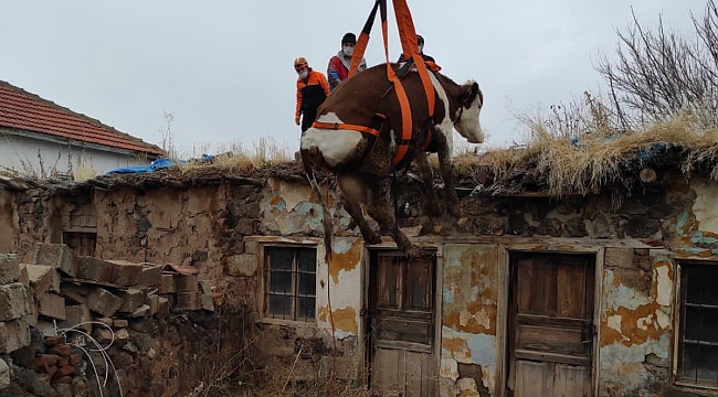 Aksaray’da bir evin damına çıkan inek, İl Afet ve Acil Durum (AFAD) Müdürlüğü ekipleri tarafından vinçle aşağı indirildi.