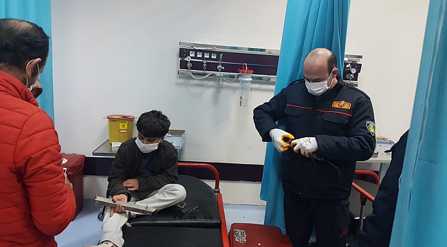 Demir parçasıyla birlikte hastaneye kaldırıldı