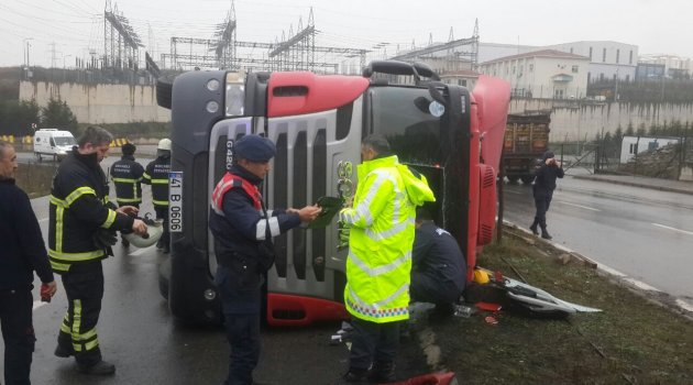 Kocaeli’nin Dilovası ilçesinde sürücüsünün kontrolünü kaybettiği demir yüklü tır devrildi. Kazada kabin içerisinde sıkışarak yaralanan sürücüyü itfaiye ekipleri kurtardı.
