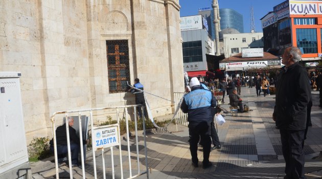 Battalgazi Belediye zabıta personeli, Yeni Cami'nin önüne şerit çekerken vatandaşlarının da zarar görmesini engelledi.