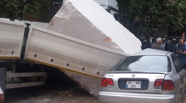 Mersin’in Erdemli ilçesinde seyir halindeki tırda yüklü mermer blok park halindeki otomobilin üzerine düştü.