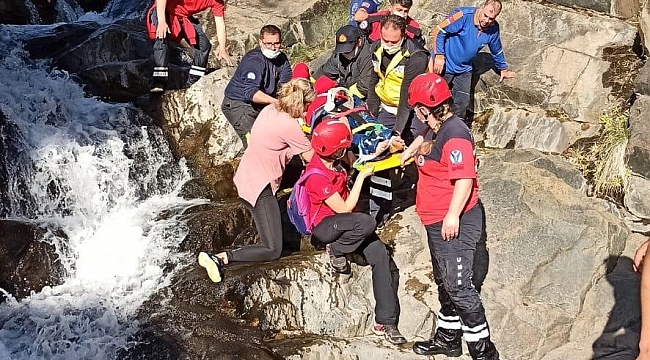 Talihsiz kadının arkadaşları 112 acil Çağrı Merkezini arayarak yardım talebinde bulundu. İlkyardım ekiplerinin yaptıkları ilk müdahalede kazazede kadının sol bilek kısmının kırıldığı, sağ bileğinin ise incindiği belirlendi. Ekipler ilk müdahalesini yaptıkları ayak bileği kırık kadını sedye ile yaklaşık 3 kilometre taşıyarak Devlet Hastanesine sevk edildi.