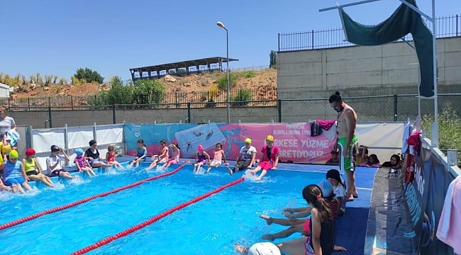 Malatya'nın Doğanşehir ilçesinde çocuk ve gençler portatif yüzme havuzunda hem yüzme öğrenip hem de serinleyerek havuz keyfi yaşıyor