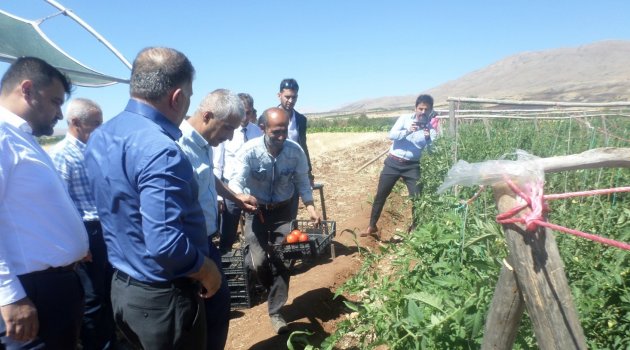 Malatya'nın Doğanşehir ilçesinde yaklaşık 1 dekarlık alanda sırık domates yetiştiriciliği yapılarak Tarla Günü düzenlendi.