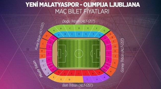 Yeni Malatyaspor- Olimpija Ljubljana maçının bilet fiyatları şu şekilde: Batı alt: 80, batı üst: 60, batı üst aile: 60, doğu alt: 45, doğu üst: 40, güney alt: 25, güney üst: 25, güney alt: 25, kuzey alt: 25, kuzey üst: 25, misafir tribün: 25 TL.