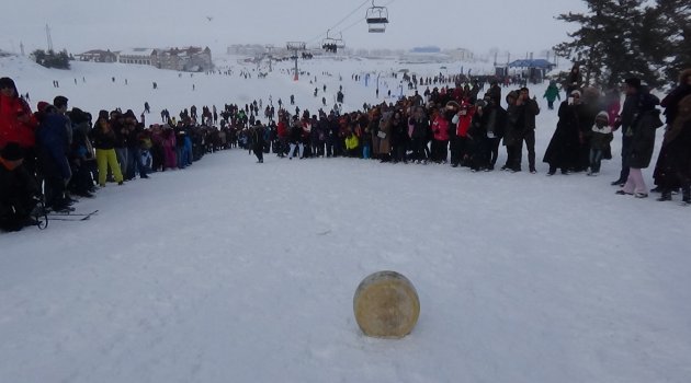 Kaşar yuvarlama yarışmasının şampiyonlarına kaptıkları kaşar hediye edildi. Sarıkamış 5. Kış Oyunları Festivali akşamda Kutsi konseriyle devam edecek.